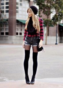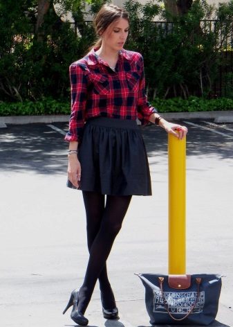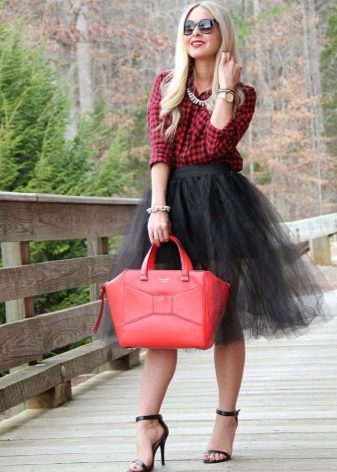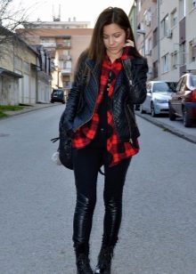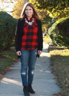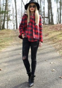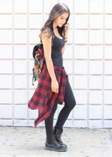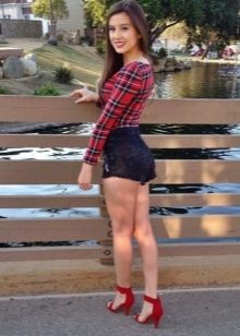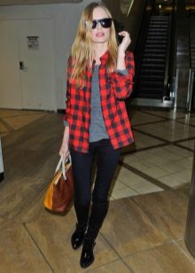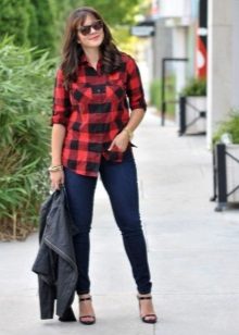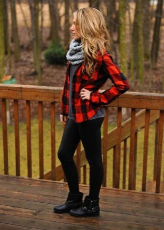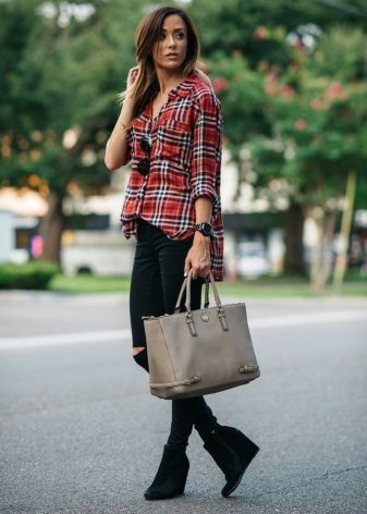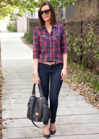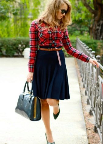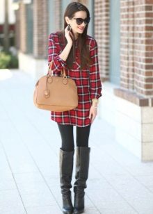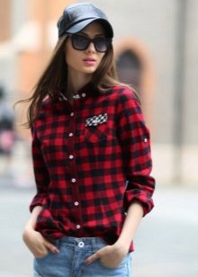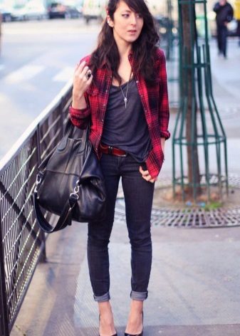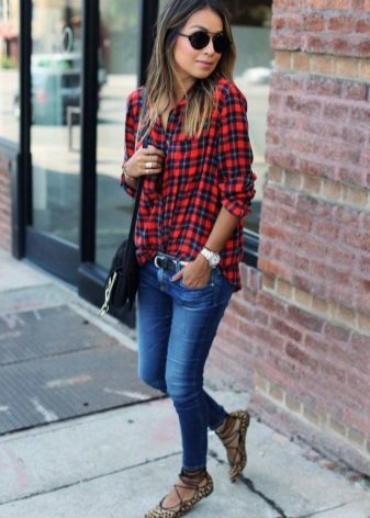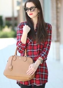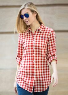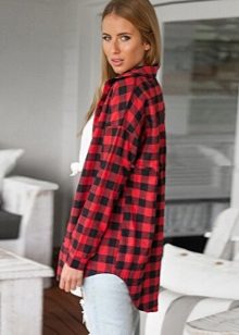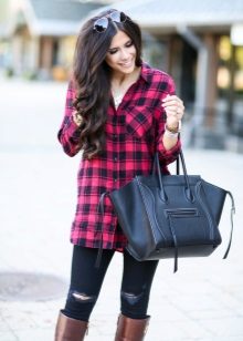 A red plaid shirt can be worn as a tunic - over a skirt or trousers, complemented by a strap. Long models should be combined with leggings or jeans. Bold fashionistas like to combine a long shirt with a short skirt or denim shorts.