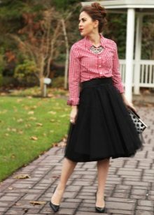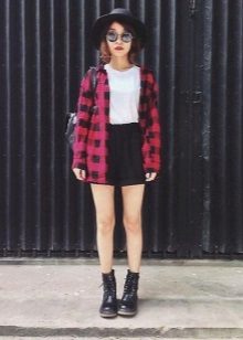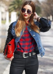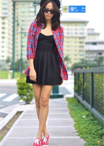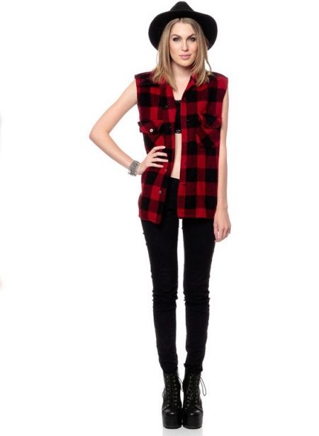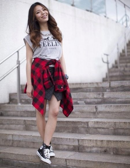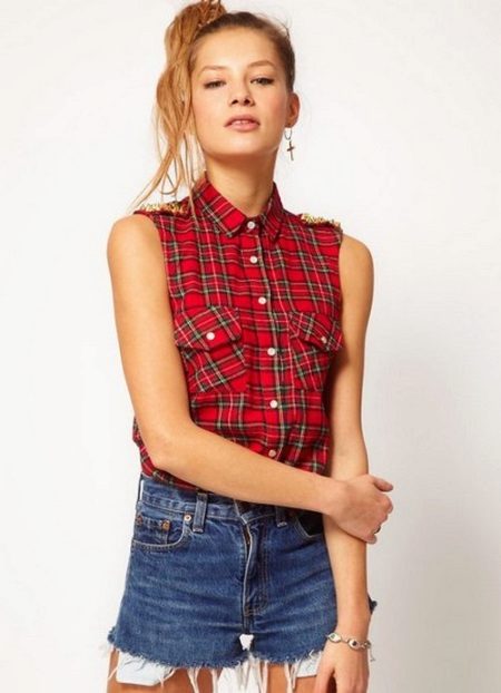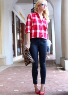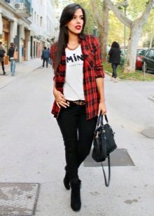 A red checked shirt can be used as a jacket. She looks advantageous in tandem with a T-shirt or t-shirt. When choosing a hem, it is worth giving preference to jeans, shorts or a leather skirt.