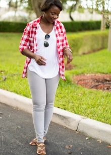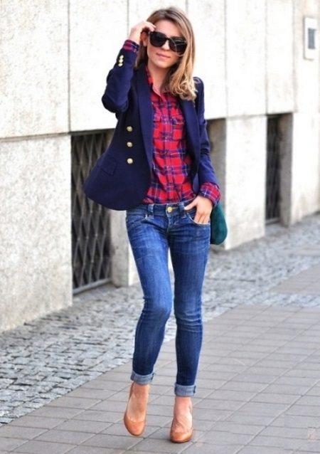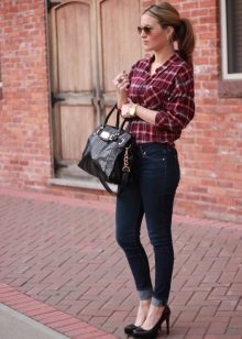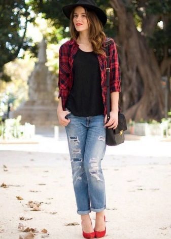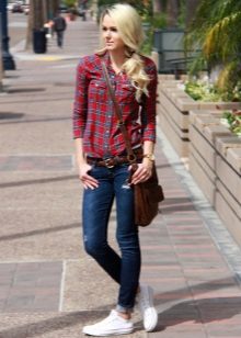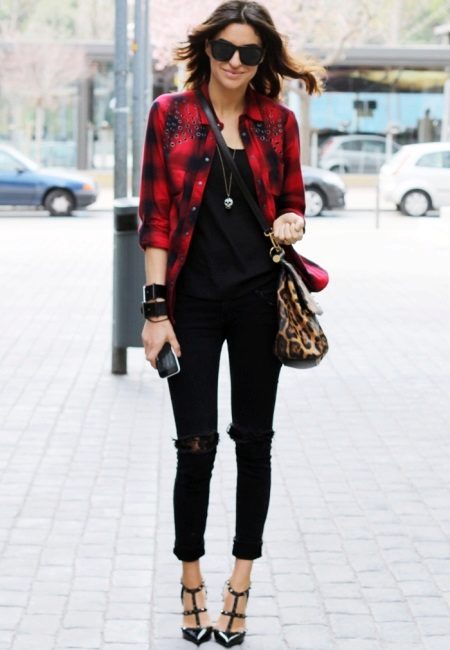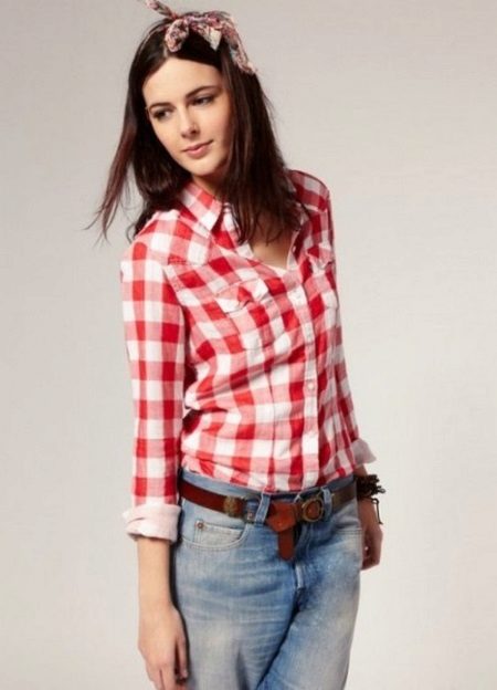 To create a stylish casual look, it is worthwhile to wear checked shirts with gins of any style.Bright and beautiful looks a white model in a red cage with a long sleeve of a classic cut in tandem with jeans by boyfriends with scuffs. A brown leather belt will perfectly complement the fashionable look and will become a unique accent.