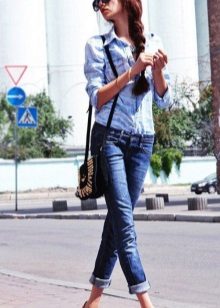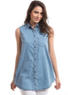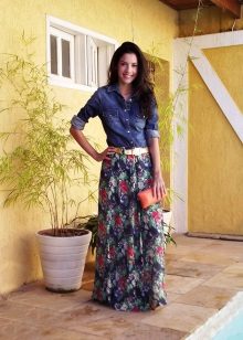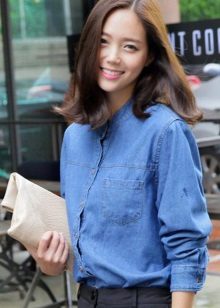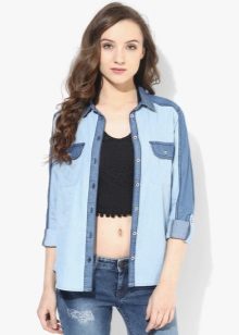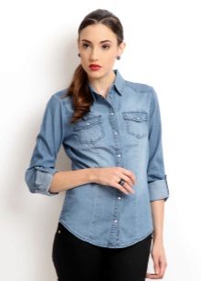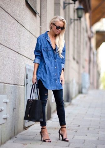 A denim shirt is perfect for embodying a casual look. It can be worn with a white miniskirt, with a colored maxi length skirt or with shorts.Many fashionistas prefer to tie a shirt at the waist in tandem with chinos. Today, flax models that imitate denim are in trend.