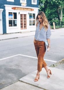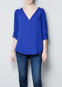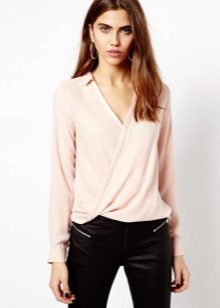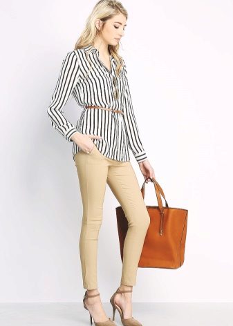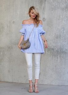 You can also pay attention to the elongated blouses of a fitted cut, decorated with straps of contrasting colors. Wide-cut blouses with a deep neckline will look perfect.