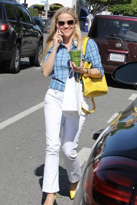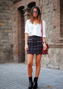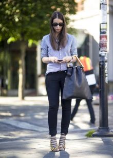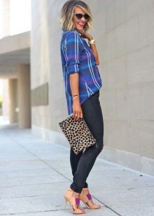 A blue checked shirt is perfect for every day. It can be combined with light jeans. The snow-white bottom will give an image of elegance and tenderness. Yellow pumps and a handbag in the tone of shoes will become a bright accent.