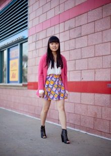 A stylish look is a tandem of a denim shirt and a geometric print mini skirt. The shirt can be tucked under the skirt, and the waist line can be decorated with an elegant brown belt.