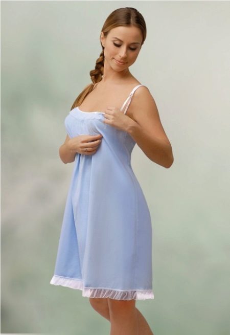 The length of the nightgown should be short. Too long shirt gets confused and fetters movement. The style is as free as possible so that the future or nursing mother feels comfortable.