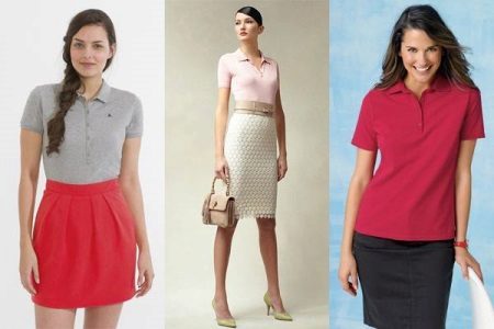 A polo with a skirt is not an ordinary combination. But a strict skirt and a plain polo of a non-screaming shade will make up an elegant duet in a business style. Either stiletto pumps or massive heeled shoes are suitable for alongside. Slender girls are better off choosing a fitted shirt and tucking it into a skirt, and ladies with curvaceous shapes should wear a loose polo to issue. Also in cool weather, the jacket will complement this look.