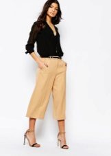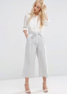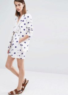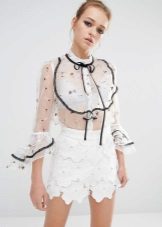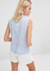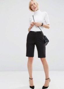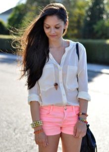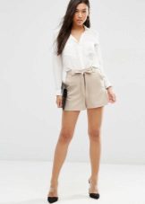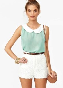 Let's start with the classics - the top is white. Shorts can be dark colors (blue, black, brown) in a classic style. Looks great white with shorts in pastel colors - beige, pale pink, light turquoise. The image will be distinguished by a special simplicity of lines.