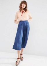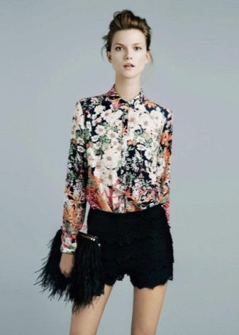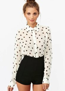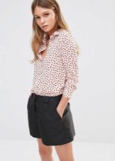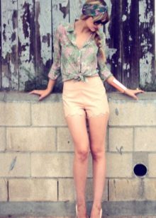 - High-waisted shorts are a graceful combination. There is something especially feminine and sexy about this. Shorts can be any model, lace trim shorts look gentle. Shirts of a shortened silhouette with wide sleeves falling from the shoulders are suitable for such a model. Oversize models made of light materials look spectacular.