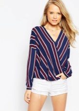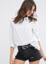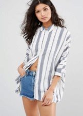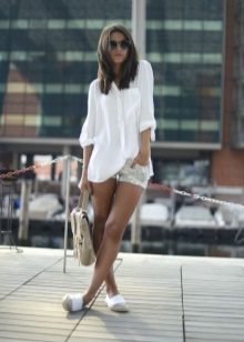 - Shirt + shorts - casual chic style. Shirts of white and blue colors, shirts with discreet print, striped look stylish. You can wear a shirt for the issue, and you can stylishly tuck one edge into the shorts. A long shirt will look original, despite the fact that it will practically hide shorts. Take a bulk bag with you.