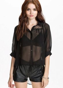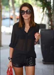 Elegant glamorous style involves a transparent shirt, you can black, and black shorts. The shirt can be a loose cut of light fabric, stylishly tucked into shorts. The model with a V-neck looks original. The image will be complemented by accessories. Here you can not do without heels.