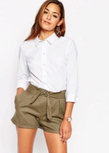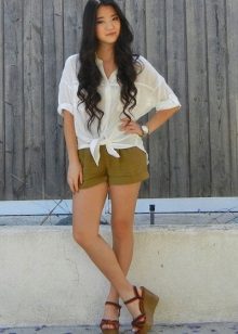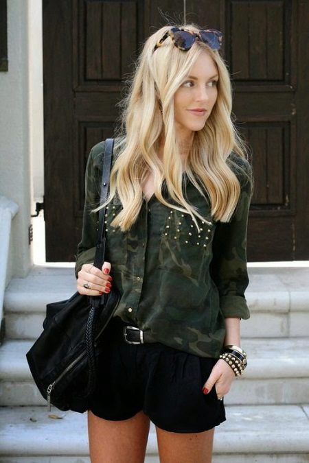 For fans of the military style, designers came up with a large number of options. Shorts can be of the following shades: pebble gray, marsh, green-beige and olive. Under such shorts, you should choose a light shirt of a straight silhouette or loose.