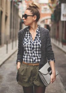 Girls very often choose a checkered shirt - this is a win-win option. Following our rules: shorts should be plain. Popular color combinations are lilac, blue with blue, turquoise, gray and beige. In cool weather, you can throw a knitted cardigan on top.