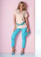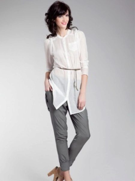 With a tunic shirt, pants that fit the figure, such as skinny pants, pipes, perfectly combine. This is one of the few options when we can wear leggings. From shoes stilettos or high-heeled shoes.