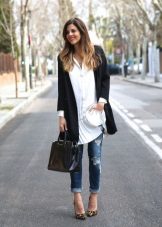 To create a casual style, use a combination with jeans, again better made narrower. Any footwear will suit: ankle boots, rough boots with buckles, sandals. You can effectively roll up your sleeves.