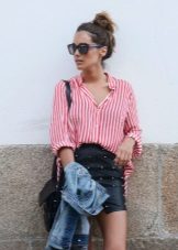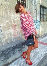 A red striped shirt blends in nicely with skinny jeans or skirts. This is a convenient and stylish option that is suitable for both everyday wear and for a party.