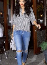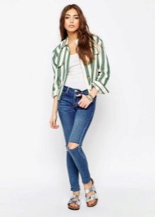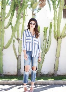 - Lovely casual look in street style, which is suitable for a warm off-season. The striped shirt deliberately casually peers out from under a voluminous gray sweater. Torn tabernacles make the image stylish and non-trivial. The outfit looks finished and stylish thanks to gray suede pumps, a black tote bag and stylish sunglasses.