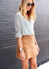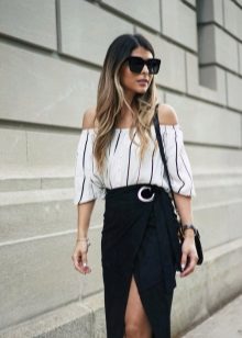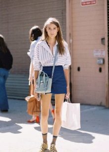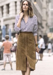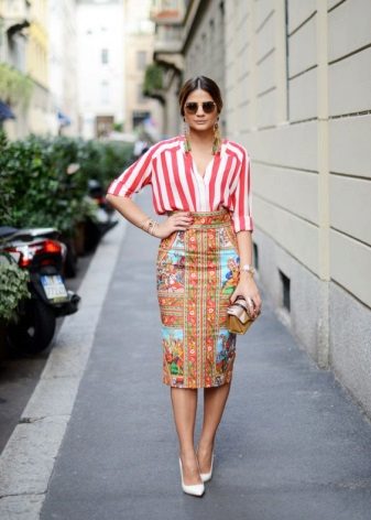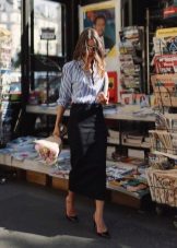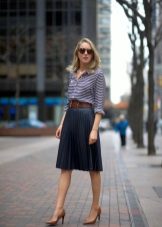 A striped shirt paired with a skirt looks very stylish and feminine. If you choose a denim skirt, get an interesting look for every day. A strict pencil skirt will complement the business image. And the airy skirt-sun fits perfectly into the ensemble for a romantic date.