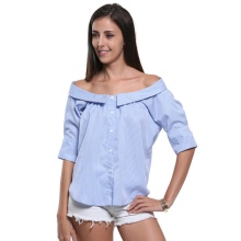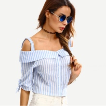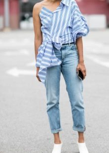 Shirts with cutouts on the shoulders are very popular this season. This style demonstrates the shoulders, but at the same time, everything else leaves the imagination of others. Most often you can find cotton stripes in small stripes. As a decorative element, bows or ruffles are used.
