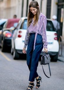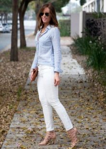 A white and blue striped shirt is one of the fashion trends that is always relevant. Depending on the trends, it can be decorated with ruffles, embroidery, lace. It can be the basis of a daily look or become an element of a festive outfit. In both cases, you will look very stylish.