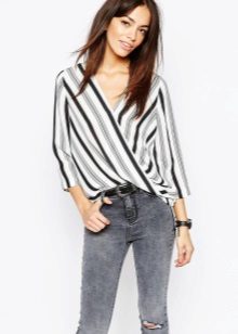 A slanting striped shirt adds piquancy and volume to your figure. This effect is especially preferable for thin girls who want to give their silhouette a more feminine shape.