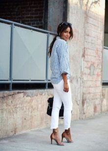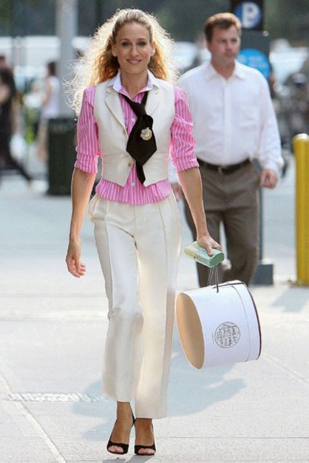 At work, you can wear a pink striped shirt with a white trouser suit, following the example of the famous Kerry Bradshaw. However, such an image is also suitable for a solemn occasion.