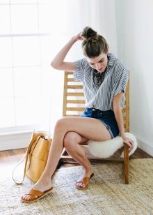 A striped shirt will look great with stylish shorts. This kit is suitable for a corporate party, date or a trip to the club. And if you prefer jeans shorts, you can clearly see that this is the perfect summer look for every day. This set looks much more interesting than shorts with a t-shirt or t-shirt.