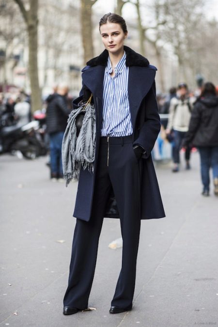 - A full-fledged business image for the winter season. Fashionable men's trousers, a white and blue striped shirt, a dark blue knee-length coat. The image is complemented by black ankle boots with a small bag and a gray scarf. Such a strict and concise combination makes the image brutal and masculine. What you need for a business businesswoman with an iron grip.