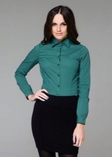 A shirt of a deep, noble shade of emerald, patina, bottle glass, made in a romantic style in combination with a long skirt-year, will be an excellent evening option for a festive dinner or going to the theater.