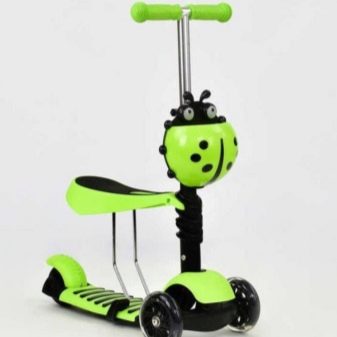 Also, the model is called "Ladybug" because of the unusual design and the presence of the head of a ladybug, which is a basket for baby's things. Two support legs are thick rods. This scooter is designed for the smallest, as the maximum withstand weight in a sitting position is 20 kg, and in a standing position - 30 kg. All materials are made of aluminum, polypropylene and fiberglass.