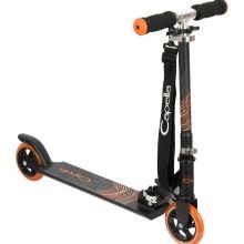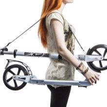 A model weighing 5.8 kg is available in three designs with graphic stickers, Designed for children from 8 years old to senior school age and for adults: The telescopic steering wheel is adjustable to 3 height levels. The design is comparable in appearance and characteristics to the model of the more expensive brand Oxelo Town 7 (France), therefore many choose Capella as a budget option. The scooter is folding, there is a durable carrying strap, a step, a rear brake system step-on brake, a mudguard. Cast wheels with a diameter of 20 cm with a polyurethane rim gently glide on the asphalt. Smooth running on small bumps provide shock absorbers installed.