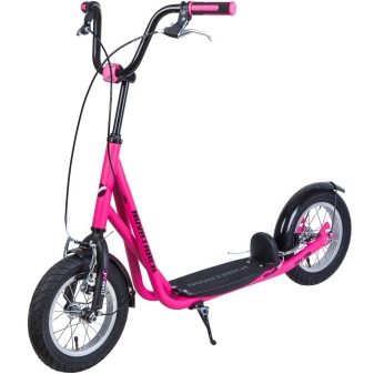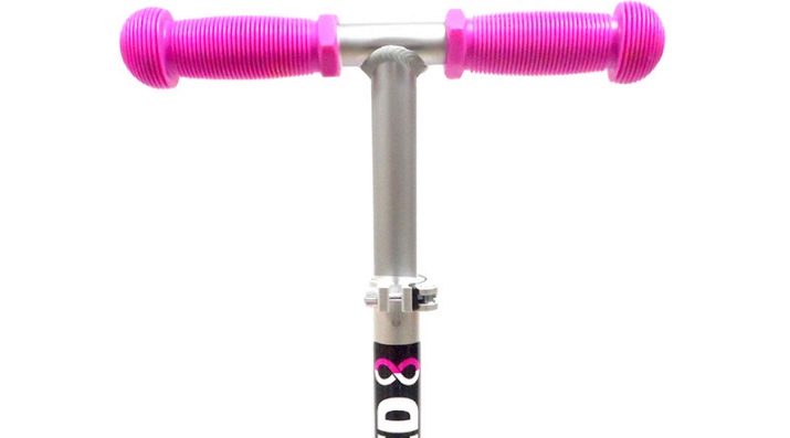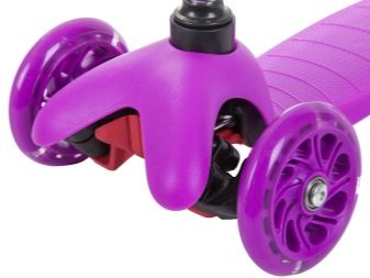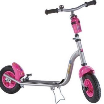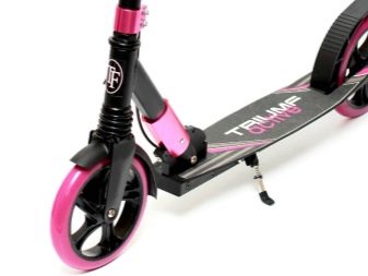 - Wheels. They are produced in two versions: from polyurethane or from rubber, in some cases - from silicone. For a girl riding on city streets, you can pick up a scooter with medium-sized wheels, preferably rubber or rubber. Remember that polyurethane wheels are more wear-resistant, but when choosing a model with such wheels, it is important to consider their diameter. In total, it is from 12 to 20 cm - the wider the wheels, the stronger the structure. A two-wheeled scooter with large wheels is suitable for teenagers. Inflatable tires will allow you to ride on an uneven surface, such wheels provide maneuverability and reliability of the product.