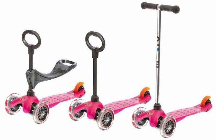 - Mini Micro 3 in 1 - these are ideal Swiss models for babies from 1 year to 3 or 4 years old. Usually they support weight up to 20 kg. The model is equipped with a T-shaped steering wheel, which allows the girl to ride even while sitting.A special seat transforms the structure into a walker. Later, when the child grows up, such a wheel changes to normal, and the seat itself is removed. This model weighs 18 kg.