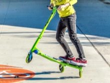- The second type of inertial scooters - "scooter scooter" is designed to ride on smooth asphalt and perform tricks. In order to make such a scooter ride, the rider makes movements resembling those made by a skier on the descent from the mountain. In this case, the body bends from side to side, and the legs slightly bent at the knees bend and unbend alternately. Such a change in body position helps to shift the center of gravity from one wheel to another, as a result of which the scooter picks up speed and moves pretty quickly. Turns to the right and left are carried out by tilting the steering wheel and the body in the right direction, which begins to be obtained after two or three workouts.