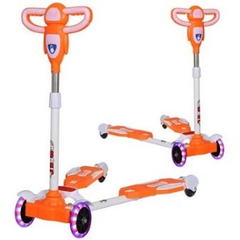 - In the first case, the rider's legs synchronously move apart and move to their original position, so the scooter begins to move. Such models are called "scooter frog", they are designed for children over 5 years old. There is no point in buying a sliding model for a younger child, since his muscles are not yet well developed to rhythmically raise and lower legs. The wheels on the "frogs" are able to rotate 360 degrees, which allows you to start moving at any position of the platforms. Models are equipped with hand brakes, have a folding design and weigh from 5 to 9 kg.The weight load of most such samples is limited to 80 kg.