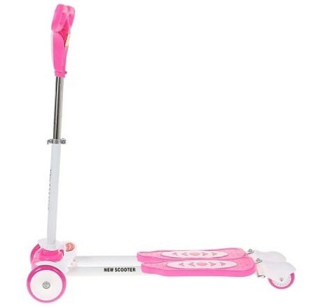 - Children's Chinese Frog Scooter Sima Land Flicker OT-25-1 driven by breeding and mixing legs and weighs 3.4 kg. The model is made in bright pink color and is designed for girls with growth from 104 to 116 cm and weighing up to 50 kg. The platforms are equipped with anti-skid spikes providing good traction with shoe soles. The diameter of the front wheel is 12.5 cm, the two rear - 8 cm each. The scooter is equipped with a foot brake, has an adjustable steering rack with a height of 70 to 84 cm, is available in dimensions 80x27x84 cm and costs 1150 rubles.