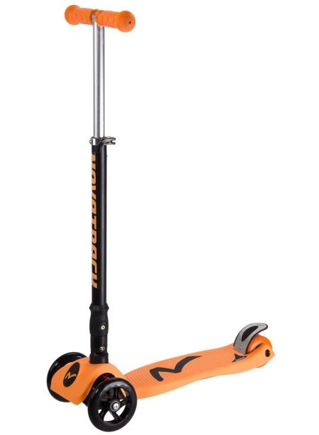 Novatrack rainbow represented primarily by the 120F. This is an attractive kids kickboard. It is designed for babies with a height of 1.04-1.16 m and weighing up to 60 kg. High-quality foot brake is provided. If necessary, the steering wheel can be adjusted.