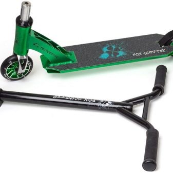 - Fox A Chinese brand specializing in the production of extreme stunt and trick scooters, as well as spare parts for them. The company produces wheels with spoke and solid wheels made of aluminum, hard polyurethane tires, ABEC 9 bearings. Two-tone versions are especially popular, in which the colors of the tire and rim have a contrasting gamut.