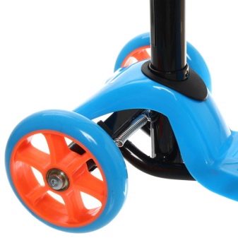- Plastic. Wheels made of polymeric materials are mainly used on scooters for babies. Models with plastic tires look bright, but have no cushioning, make a lot of noise when riding, and weigh a little. They can not withstand a large load, they are focused on use exclusively on a flat asphalt surface.