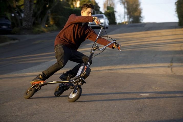 These scooters should not be confused with trike bikes. The devices are equipped with 3 wheels, but their main difference from kickboards is the presence of 2 short decks. In certain cases, the support platforms are made in the form of a transverse bar. Such instances are called inertial scooters, since they manage to ride them without contacting the road. In the basic configuration, the models are equipped with 2 foot brakes. For the purpose of comfortable control, the devices are often equipped with manual brake systems. Trikes are characterized by such advantages: