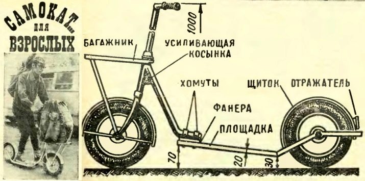 In those days, such an innovation became something truly unusual. The “adult” scooter was capable of transporting the user 50 m from a single repulsive movement of the leg. The design could be equipped with a load of 30 kg. The scooter was a modified children's model "Orlik" with a lowered platform. The wheels in the "adult" design were attached using special lever nuts, they could be easily removed. Products were complemented by a trunk from a bicycle frame.