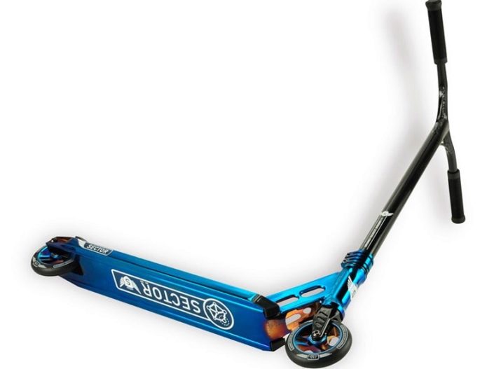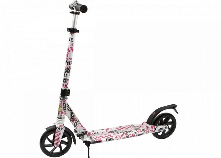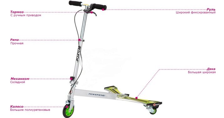 The front wheel is much larger in diameter than the rear wheels, and the platform is bifurcated. Its appearance resembles the wings of a butterfly, which is why this model got its unofficial name. The wheels are made of polyurethane, which makes the ride more comfortable. The width of the wings is 32 centimeters. The weight of the model is 5 kilograms. In addition, it is equipped with very reliable and sturdy bearings. And also the scooter complements the convenient hand brake.