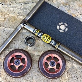 Basically, the wheels on children's scooters have a diameter of 98 or 100 mm. There are also models with wheel diameters of 80, 100, 110, 125, 145, 175, 180 and 200 mm. The larger the diameter of the wheel, the better the cross-country ability on the scooter along increasingly bad roads with cracks, gravel, broken asphalt and other obstacles. Types of bearings are presented. brands Flashrider 360, Proto Gripper, Slamm, BlackVoice V2 and several others.