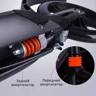 Since the front wheel plays a significant role in almost any technique, it was originally equipped with a shock spring. But progress does not stand still, and today on sale there are models of scooters with shock absorption on two wheels: front and rear.