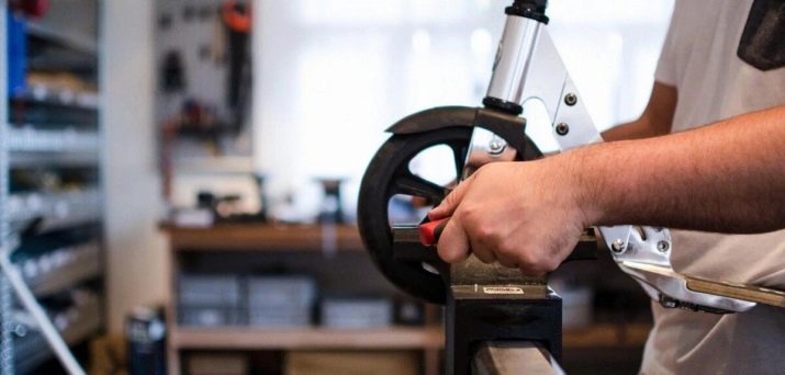 Consider the most popular - mechanical - type, which we will configure. To begin with, the steering wheel must be in working condition (that is, not folded up for transportation or storage), since the pads press on the disc without pressing the handle. The complexity of this design, which differs from that of a bicycle, does not make it possible to comfortably tune without removing the rear wing.