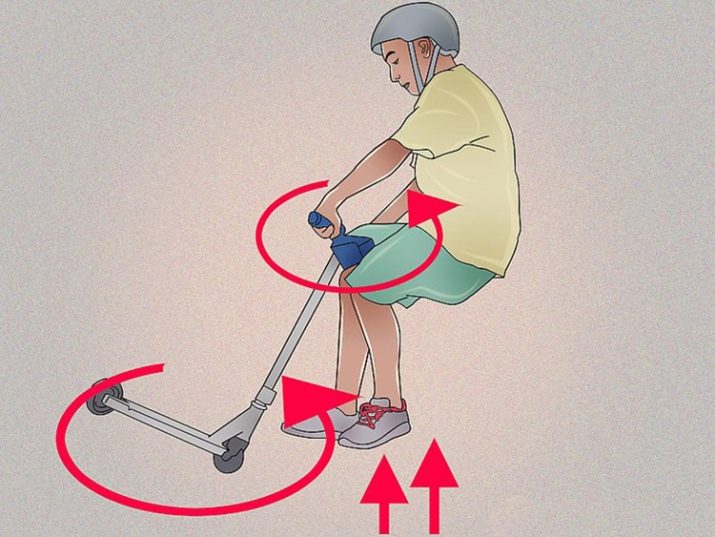 In this case, the athlete performs a jump with a parallel turn of the scooter in the opposite direction. The execution is as follows: you move and carefully make the jump, in the jump you need to turn 180 degrees, for this you need to turn your head and shoulders. In essence, you have to look as if you were behind your shoulders, in this case your legs and transport will spin after the body. When grounding, relax a little and slightly bend your knees to soften the landing.