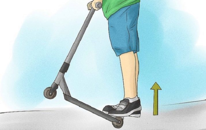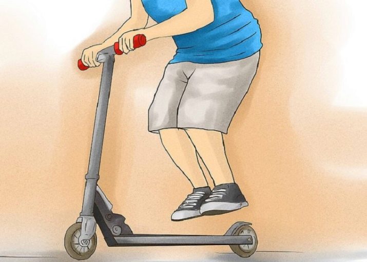Now on a horizontal surface you need to learn how to combine these two elements: bounce as high as possible and make a turn. At first, it is best to land on your feet, that is, to jump off a scooter. In this case, it is necessary not only with one foot to make a push for scrolling, but immediately with both and landing also on both legs simultaneously.