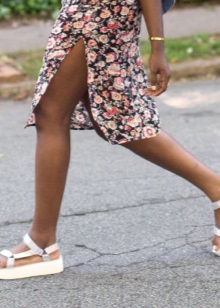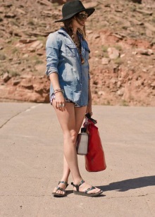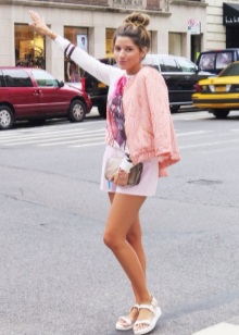 Most often, fashionistas combine summer sandals with sports-style clothing. The most common option is short knitted shorts and a loose T-shirt with interesting prints. The t-shirt can be replaced with a top in saturated color, a spacious T-shirt and jacket.