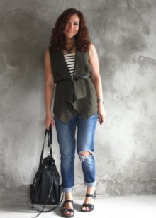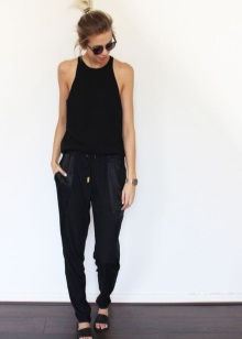 The best option is the upper and sandals, decorated in the same color. Pick accessories to make the look complete. Sports bags and backpacks, as well as neckerchiefs and belts, are ideal.