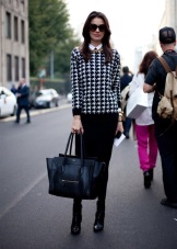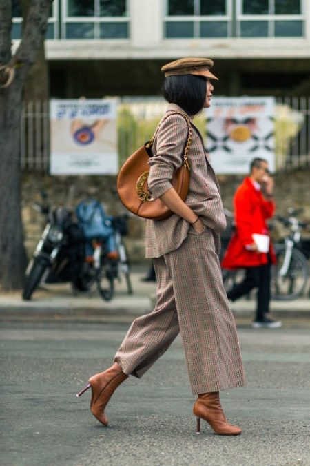 - Stylish business look of a confident girl. A small check trouser suit consisting of a jacket and culottes, brown heeled ankle boots, a crescent bag and a tone cap.It remains to complement the image with a warm fitted coat and you can conquer the peaks!