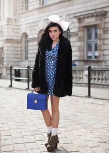 - The perfect look for a date! A short dress with a floral print in the style of boho, moderately stylish and chaste and velvet ankle boots in dark blue. A short fur coat made of faux fur will complement the image.