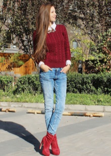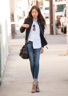 If you go for a walk with friends or go to the movies, give preference to boyfriend jeans, tucking them so that they slightly expose your ankle. Thus, you will focus on the thinnest part of the leg. You can complement the image with a jumper or sweatshirt.